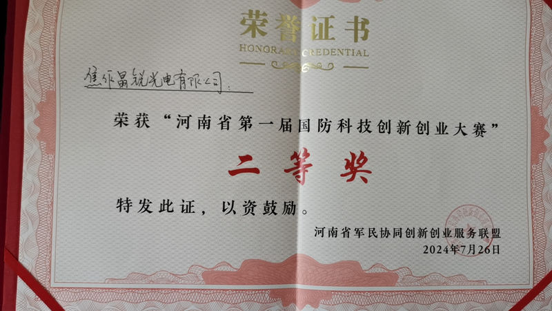 焦作晶銳光電有限公司榮獲河南省第一屆國防科技創(chuàng)新創(chuàng)業(yè)大賽二等獎